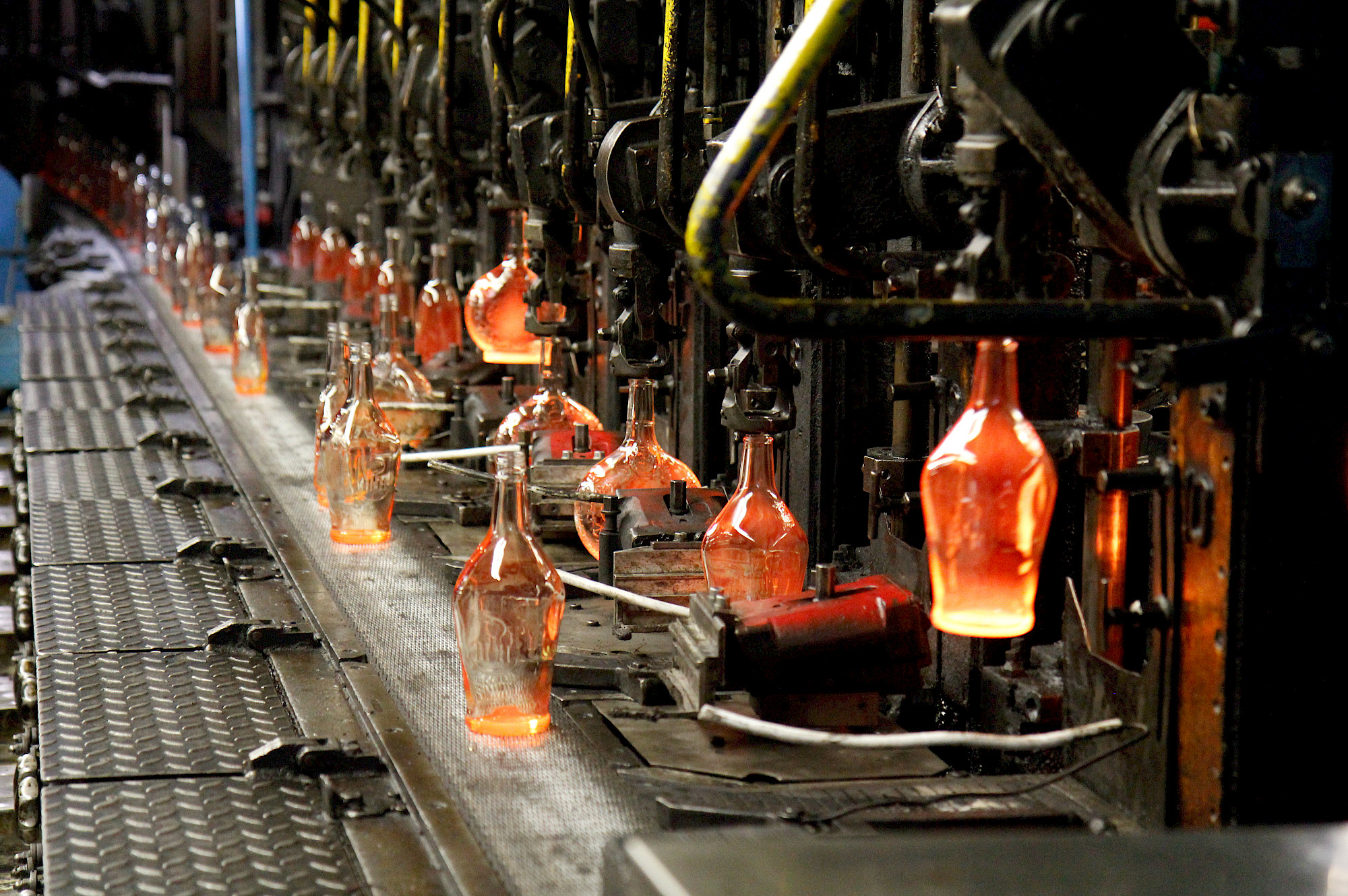 In Holzminden werden täglich ca. 900.000 Flaschen im Glass Blow Moulding Verfahren hergestellt. Eine ausgiebige Führung durch die Fabrik führte an allen wichtigen Stationen vorbei. Zu Beginn konnte am heißen Ende betrachtet werden, wie genau abgewogene Tropfen noch zähflüssiges Glas in die jeweiligen Formen fallen. Im ersten Schritt wird so das Mundstück mit dem Gewinde geformt. Wenige Sekunden später werden die noch heißen Flaschen umgedreht und in einer zweiten Form hohlgeblasen. Die noch ca. 400 Grad warmen Flaschen werden nun in einem Kühlofen langsam abgekühlt um Spannungen zu vermeiden. Anschließend werden die Flaschen sortiert, aufwändig auf Defekte kontrolliert und schließlich verpackt.