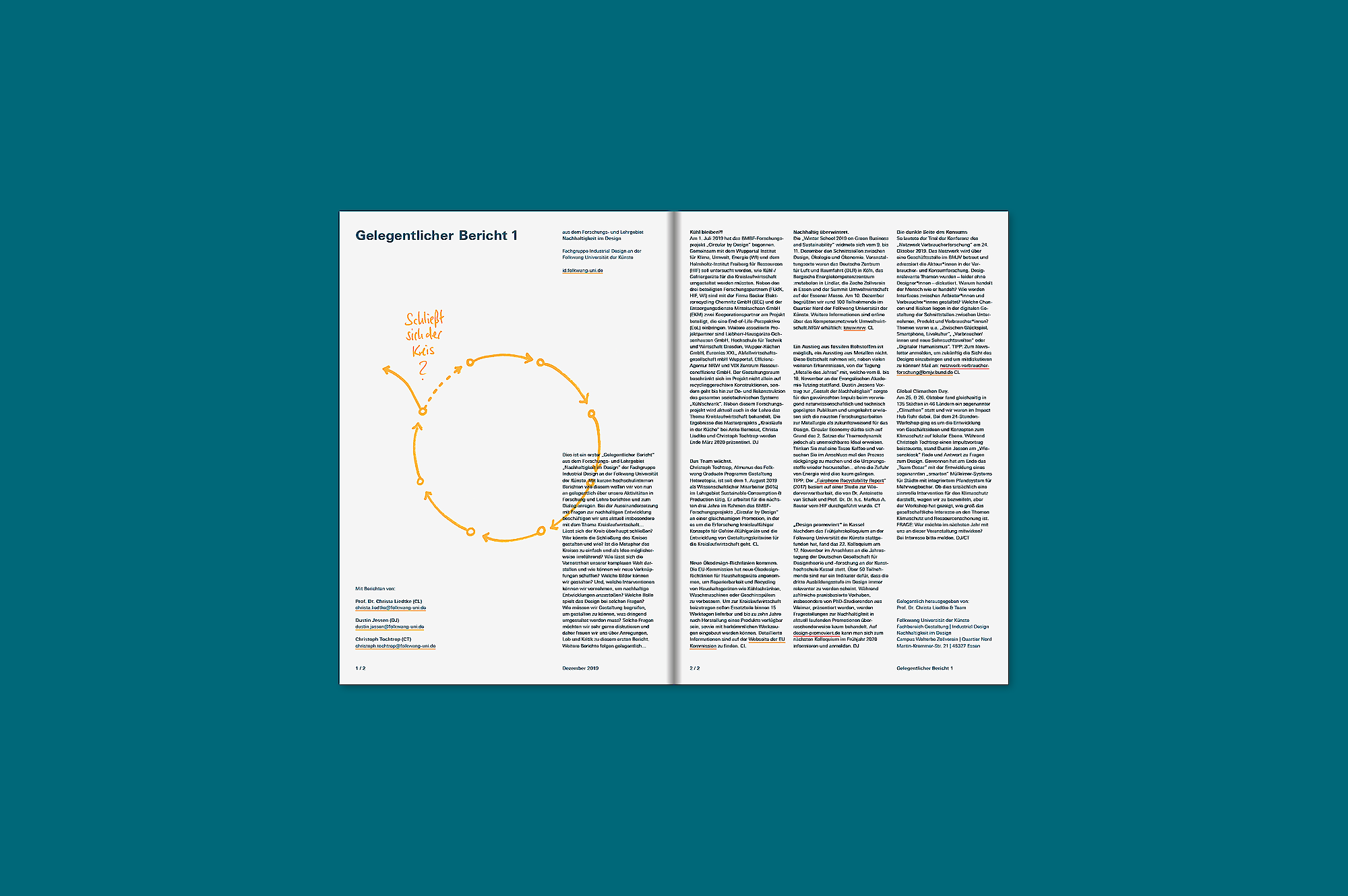 Dies ist ein erster „Gelegentlicher Bericht“ aus dem Forschungs- und Lehrgebiet „Nachhaltigkeit im Design“ der Fachgruppe Industrial Design an der Folkwang Universität der Künste. Mit kurzen hochschulinternen Berichten wie diesem wollen wir von nun an gelegentlich über unsere Aktivitäten in Forschung und Lehre berichten und zum Dialog anregen. Bei der Auseinandersetzung mit Fragen zur nachhaltigen Entwicklung beschäftigen wir uns aktuell insbesondere mit dem Thema Kreislaufwirtschaft… Lässt sich der Kreis überhaupt schließen? Wer könnte die Schließung des Kreises gestalten und wie? Ist die Metapher des Kreises zu einfach und als Idee möglicherweise irreführend? Wie lässt sich die Vernetztheit unserer komplexen Welt darstellen und wie können wir neue Verknüpfungen schaffen? Welche Bilder können wir gestalten? Und, welche Interventionen können wir vornehmen, um nachhaltige Entwicklungen anzustoßen? Welche Rolle spielt das Design bei solchen Fragen? Wie müssen wir Gestaltung begreifen, um gestalten zu können, was dringend umgestaltet werden muss? Solche Fragen möchten wir sehr gerne diskutieren und daher freuen wir uns über Anregungen, Lob und Kritik zu diesem ersten Bericht. Weitere Berichte folgen gelegentlich…