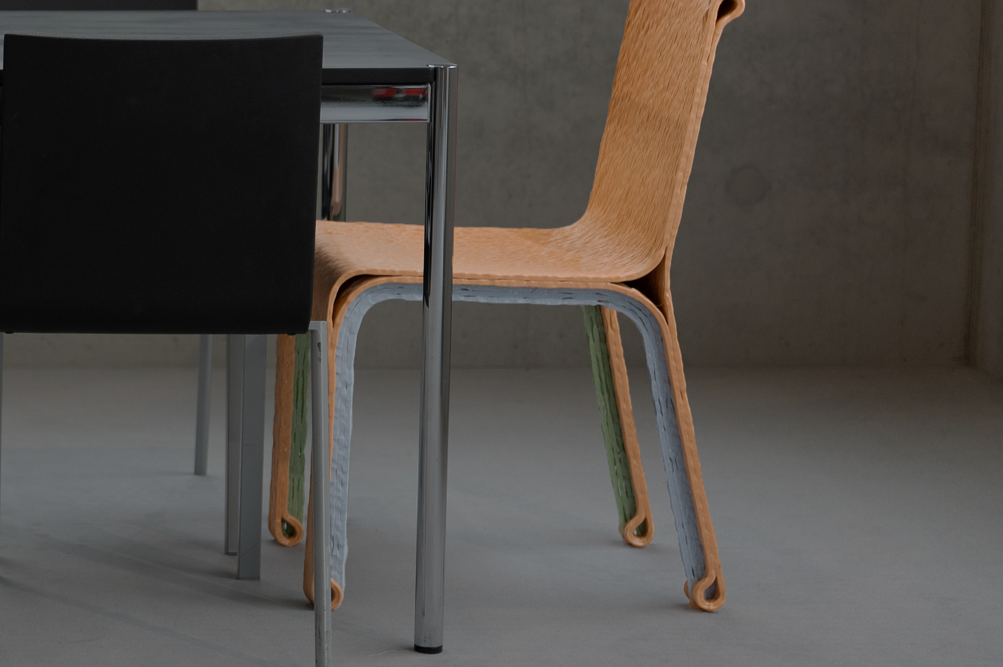 Die Formgebung des Stuhls ergibt sich direkt aus dem additiven Prozess und verbindet Ressourceneffizienz mit einer neuartigen, technisch geprägten Ästhetik. Statt einer massiven Füllung (Infill) wird der Stuhl als dickwandiges Profil gefertigt, was Materialverbrauch und Produktionszeit signifikant senkt. Die farbigen Einsätze in den Beinen sind dabei mehr als ein reines Gestaltungsdetail: Sie werden direkt im Druckprozess integriert, sorgen für die notwendige Stabilität und heben so die einzigartige Konstruktion des Stuhls hervor.