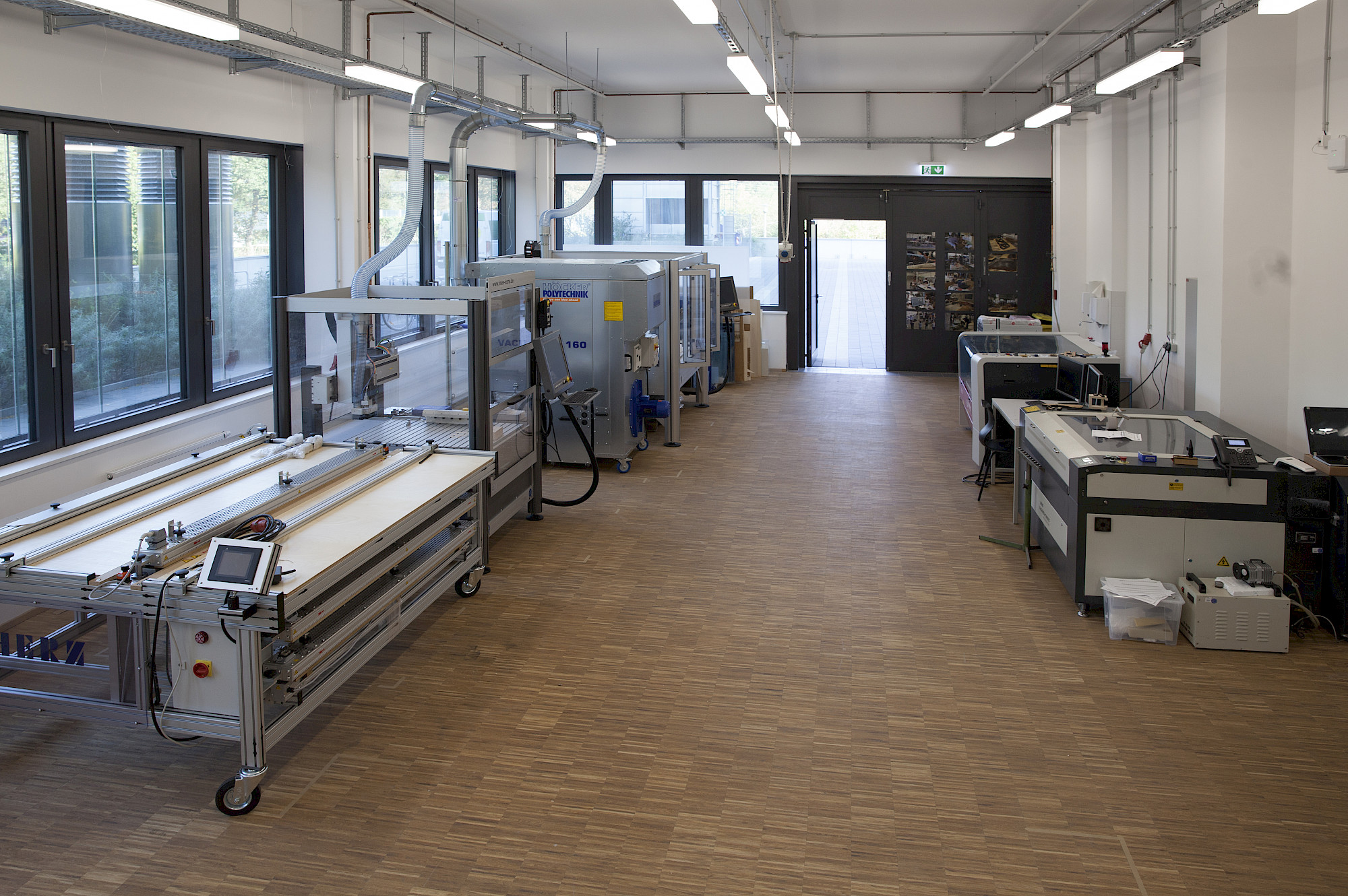 Die Kunststoffwerkstatt bietet verschiedene Möglichkeiten zur Bearbeitung von diversen Kunststoffen. Neben Maschinen zum Umformen von Plattenmaterial (Kunststoffbiege und -abkantmaschine und Vakuumtiefziehmaschine) gibt es eine 3-Achs-CNC-Fräse für PU-Schaumplatten und zwei Laserschneider, mit denen neben Acryl, Polystyrol und einigen weiteren Kunststoffen auch andere Materialien wie zum Beispiel Textilien, Leder, Filz etc. geschnitten und graviert werden können. Mit einer weiteren 3-Achs-CNC-Fräse kann zudem Holz bearbeitet werden.